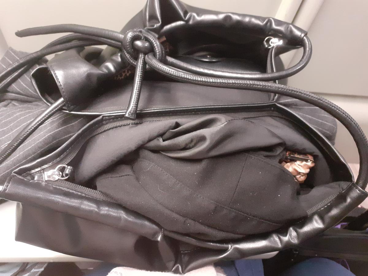 Zwarte damestas met inhoud en grijs jasje