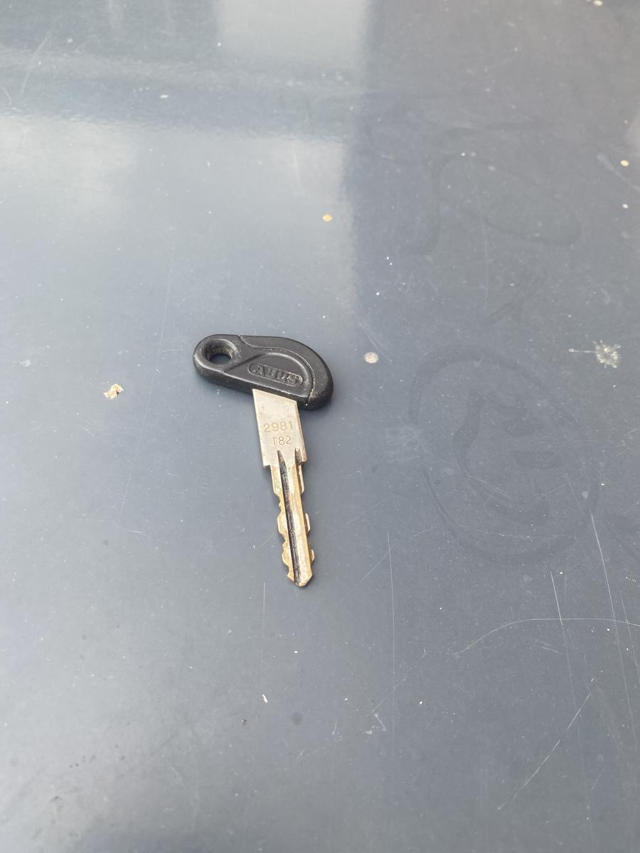 Super73 e-bike key and ABUS lock key on a keychai