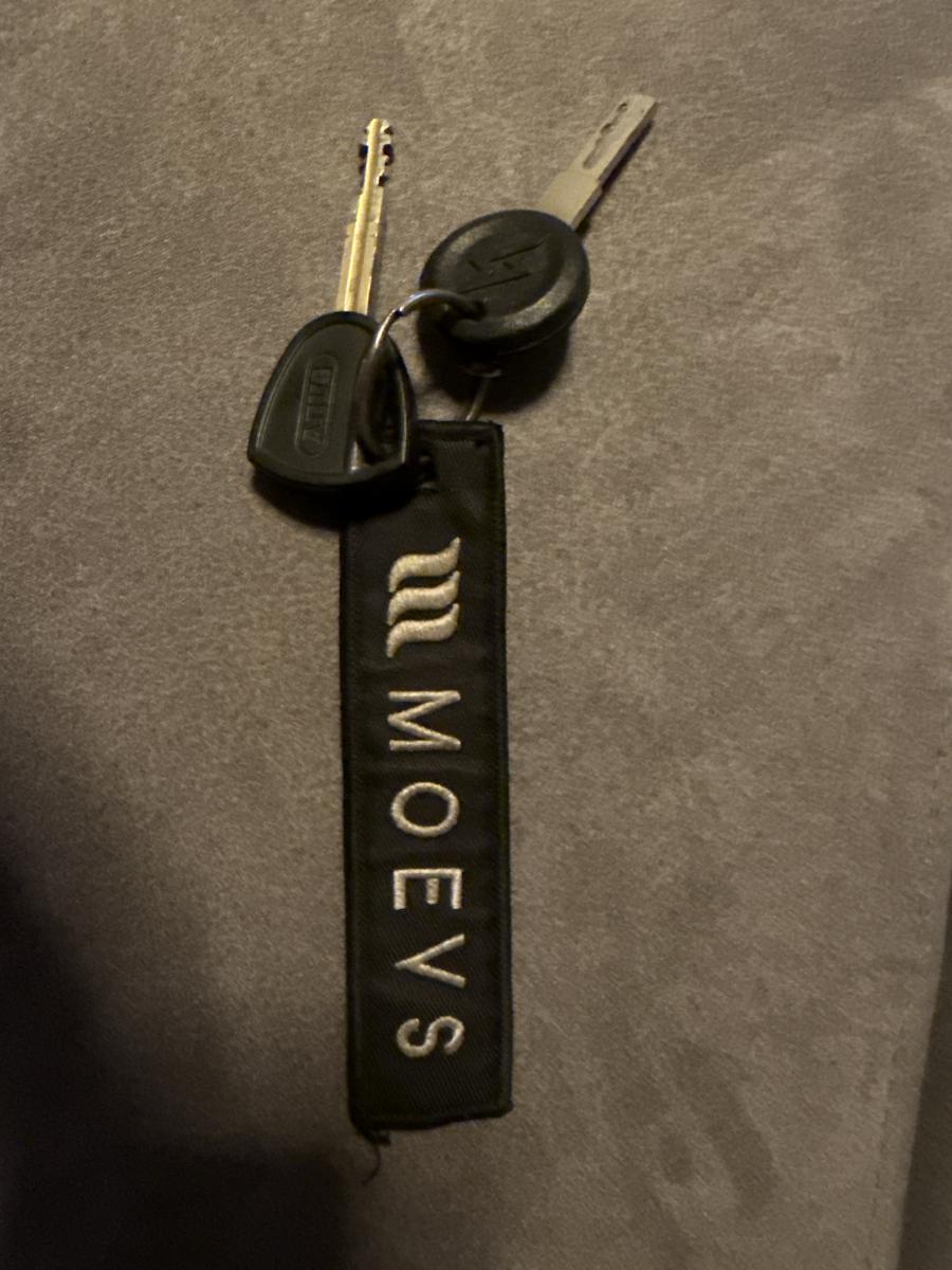 Super73 e-bike key and ABUS lock key on a keychai