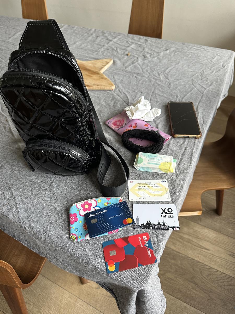 Small blue bag with passports, mobile phones.
