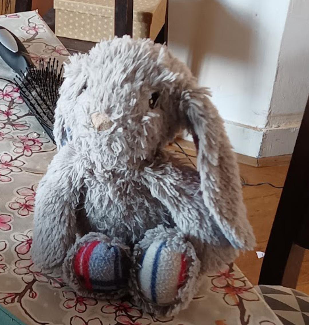 Het is een kinder rugzak roze pastel met regenboog kleuren Het belangrijkste is dat er een grijs knuffel konijn in zit