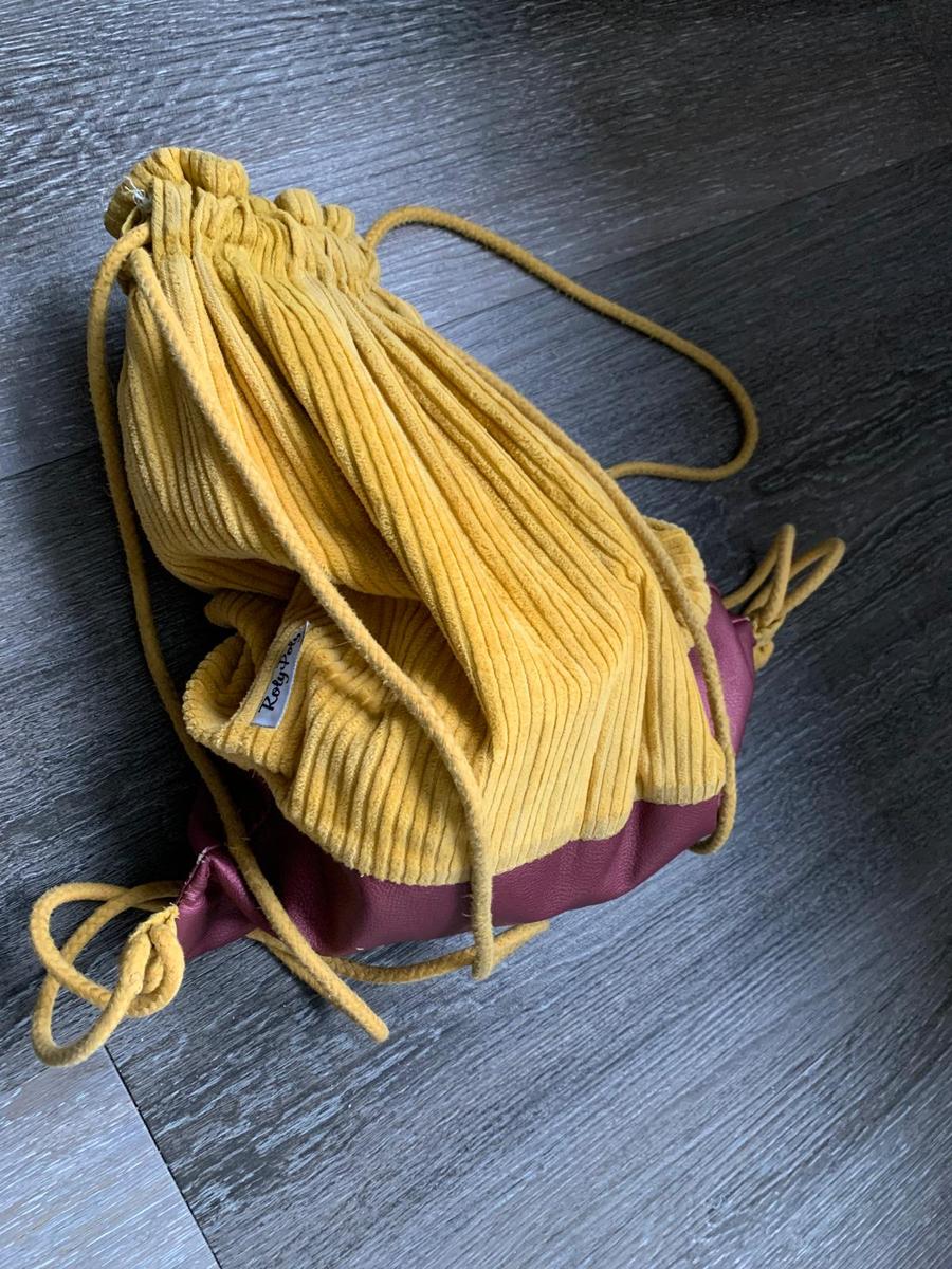 gele tas corduroy met inhoud