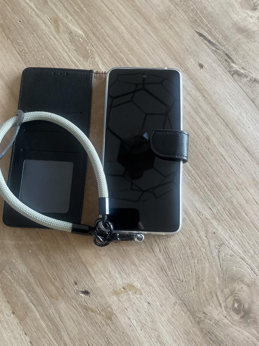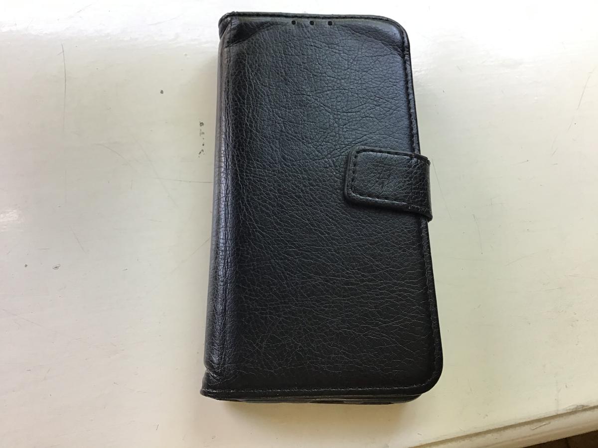 Samsung mobieltje in zwartlederen klaphoesje