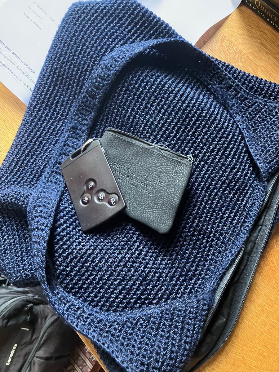 Blauw gehaakt tasje met autosleutel